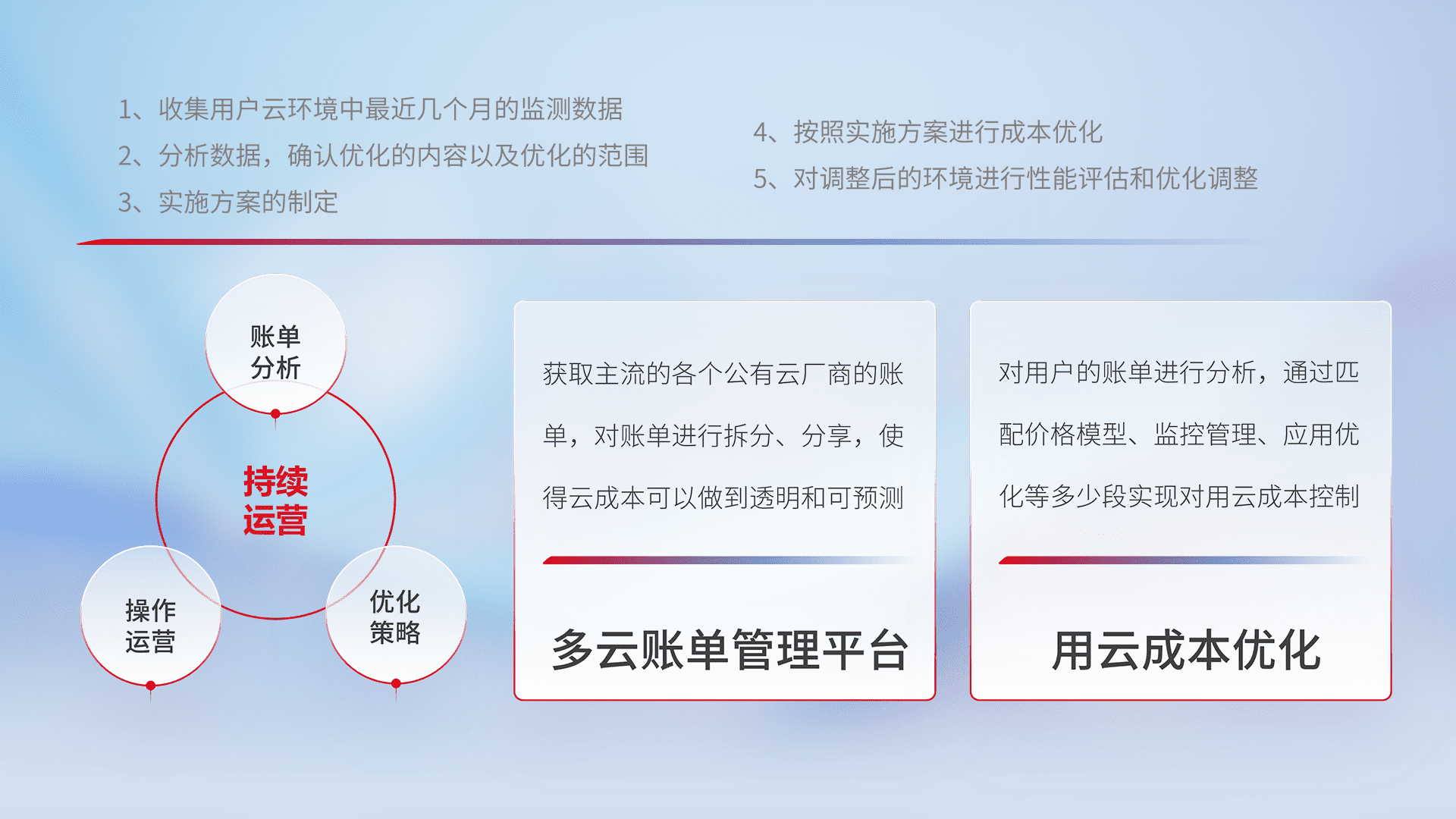 通过多云纳管,,,以统一的资源数据模型把客户的云资源进行抽象和封装,,,,进而实现对多云资源的统一操作,,,,保障云资源管理的可靠性、、、、稳定性与可用性。。量身定制化运维内容,,配置、、开发运维、、、补丁管理、、、、备份、、、监控、、认证和访问管理、、、审计和日常巡检等,,,保障在用云过程中的可靠度,,稳定度以及高可用率。。。